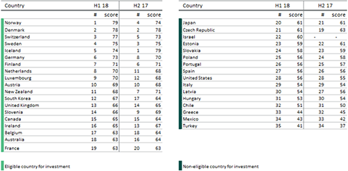 Im aktuellen Länder-Vergleich wird Deutschland auf Platz 6 von insgesamt 35 OECD-Staaten, und damit einen Rang höher als im 2. Halbjahr 2017, geführt. „In der Summe zählt Deutschland zu den nachhaltigsten Staaten weltweit. In den vergangenen 5 Jahren hat es sich in dieser Hinsicht sukzessive verbessert – ein Trend, der sich auf globaler Ebene, also sowohl bei Schwellenländern als auch entwickelten Staaten, beobachten lässt. Dies ist eine erfreuliche Entwicklung. Allerdings bleibt viel Potenzial, noch nachhaltiger zu werden – auch für Deutschland“, sagt Ophélie Mortier, Head of Responsible Investments bei Degroof Petercam AM.