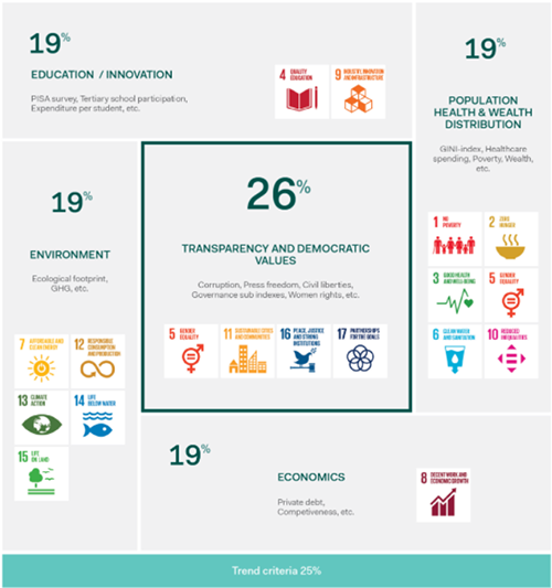 Die aktuellen Ergebnisse dieser Analyse sind in nachfolgender Grafik ersichtlich. Zu je 19 Prozent fließen die Kriterien ‚Umwelt‘, ‚Bildung und Innovation‘, ‚Gesundheit und Vermögensverteilung der Bevölkerung‘ sowie ‚Wirtschaft‘ ein, während ‚Transparenz und demokratische Werte‘ mit 26 Prozent gewichtet werden.