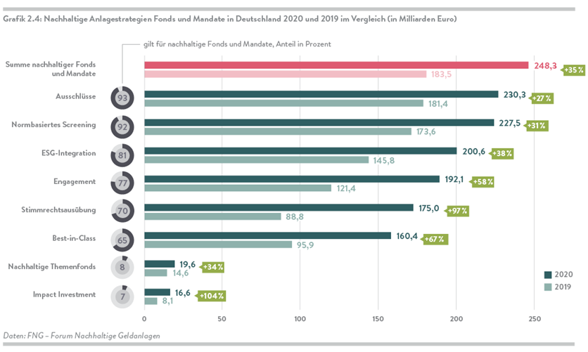 Die nachfolgende Grafik aus dem FNG Marktbericht 2020 verdeutlich diese Umstände gut – Impact Investing-Anlagestrategien finden sich an letzter Stelle, haben im Vorjahresvergleich jedoch den größten Zuwachs zu verzeichnen.