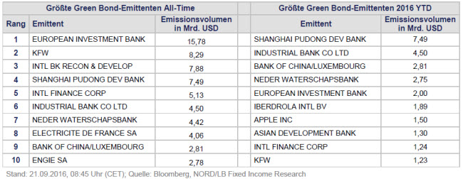 Die größten Emittenten von Green Bonds sind im SSA-Sektor zu Hause. Die supranationalen Akteure wie die European Investment Bank oder die KfW Bank führen die Liste mit den größten Green Bond Ausgaben an. Gut 40 % der laufenden Bonds kommen nach einer Erhebung von Bloomberg und LLBW aus diesem Sektor. Weitere 29 % stammen aus dem Bereich der Geschäftsbanken. Aber auch Non-Financial Unternehmen wie Apple drängen auf den Markt. Sie stellen inzwischen gut 26% der Emissionen, Staatliche Anleihen dagegen nur 5 %. Bis zum Jahr 2012 lag der Emissions-Anteil der SSAs noch bei 100%. Seitdem nimmt ihr Anteil am Ausgabe-Volumen ständig ab. 2016 wurde ihre Vorreiterschaft von den Finanzinstituten (46 %) und nicht-finanziellen Unternehmen (28 %) abgelöst. SSAs emittierten 2016 nur 25 % des Gesamtvolumens.