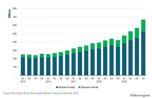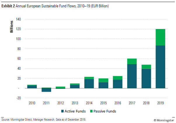 Die Verkaufserfolge haben enorme Wirkung auf den Markt: Laut Morningstar ist das in europäischen Ländern investierte Vermögen in ESG-Fonds per Ende 2019 im Vergleich zum Vorjahr um 56 Prozent auf 668 Milliarden Euro angestiegen. Auch das ist ein neuer Rekord. Indexfonds mit ESG-Mandat machen dabei inzwischen 21 Prozent des gesamten ESG-Fondsvermögens aus.