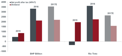 Other miners appear to be following suit. Anglo American is set to update its policy in mid-2017. The chart below shows the year-on-year second half net profits and dividends for BHP Biliton and Rio Tinto, highlighting the improving profit rebound and the shift in dividend policy