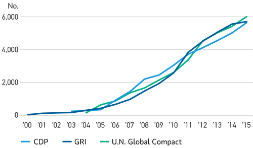 (Source: Carbon Disclosure Project (CDP), Global Reporting Initiative (GRI), and United NationsGlobal Compact. Data as of November 30, 2016.)