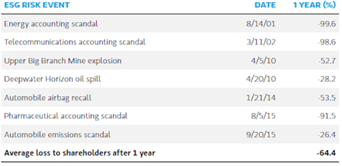 In recent years, shareholders have suffered substantial losses following ESG risk events (Display 2). The negative environment and social impacts of oil spills, mining explosions and unsafe products can be fatal, and the cost to shareholders can be severe. In addition, poor governance and accounting controls can undermine the success of even great businesses characterized by sustainable competitive advantages and long-term growth prospects. While there is no silver bullet to avoid such catastrophes, we believe that incorporating ESG analysis can mitigate these risks.