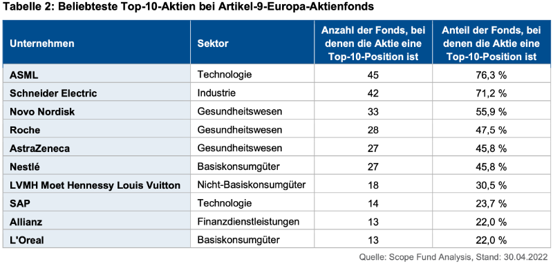 Unter den Aktienfonds mit regionalem Fokus auf Europa sei die Konzentration noch höher, schreibt die Analystin Simone Schieg, die Autorin der Studie. In 45 der insgesamt 59 Artikel-9-Fonds aus den betrachteten europäischen Peergroups gehöre das Halbleiterunternehmen ASML zu den Top-Positionen. Das entspreche einem Anteil von mehr als 75 Prozent. Die Aktie von Schneider Electric ist 42-mal in den Top-10 vertreten, der dänische Pharmakonzern Novo Nordisk 33-mal.