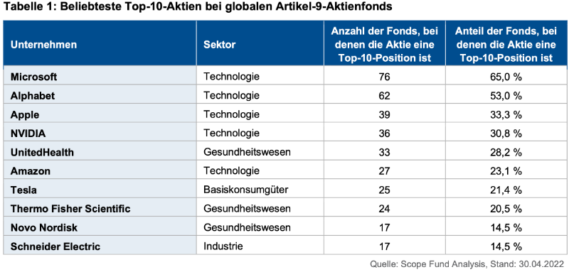 Doch auch wenn die Umsetzung tatsächlich ab Januar 2023 erfolgen sollte, bleiben Fragen offen. Zum Beispiel, was einen Artikel-9-Fonds in der Praxis von anderen Fonds unterscheidet. Eine aktuelle Studie der Ratingagentur Scope zeigt: Die Top-Ten-Positionen in den Artikel-9-Fonds unterscheiden sich kaum von denen klassischer Fonds ohne Artikel-9-Klassifizierung. So führt zum Beispiel bei global investierenden Portfolios der Softwaregigant Microsoft die Rangliste an. Knapp zwei Drittel der 117 Artikel-9-Aktienfonds aus den untersuchten globalen Peergroups halten die Aktie als eine der zehn größten Positionen in ihrem Bestand. Sehr häufig vertreten ist auch die Aktie von Alphabet, die bei etwas mehr als jedem zweiten Fonds in den Top-10 auftaucht. Apple auf Platz 3 findet sich in jedem dritten Portfolio unter den zehn größten Werten.S