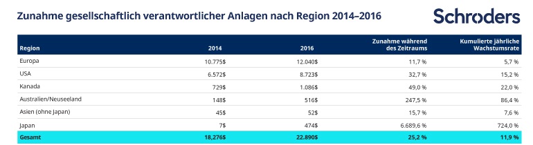 Hinweis: Anlagewerte in Milliarden. Anlagen aus Asien ohne Japan für 2014 werden in US-Dollar basierend auf den Wechselkursen zum Jahresende 2013 angegeben. Alle anderen Anlagen, wie auch alle Anlagen 2016, werden in US-Dollar basierend auf den Wechselkursen zum Jahresende 2015 angegeben. Quelle: Global Sustainable Investment Alliance.