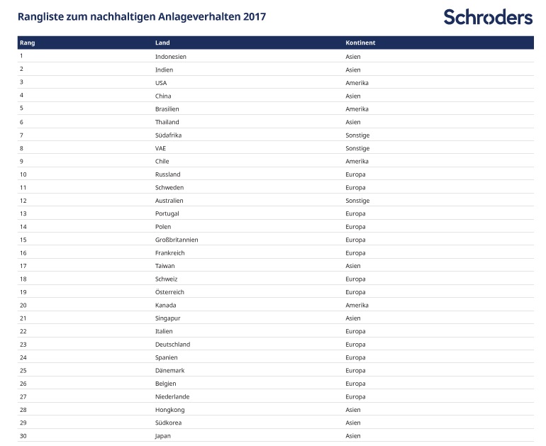 Im Rahmen der Schroders Global Investor Study 2017 (GIS) wurden 22.100 Anleger weltweit befragt. Die Studie kommt zu dem Ergebnis, dass asiatische Länder sowohl das obere als auch das untere Ende der Rangliste zum nachhaltigen Anlageverhalten dominieren. Indien liegt auf Platz zwei und China auf Platz vier.