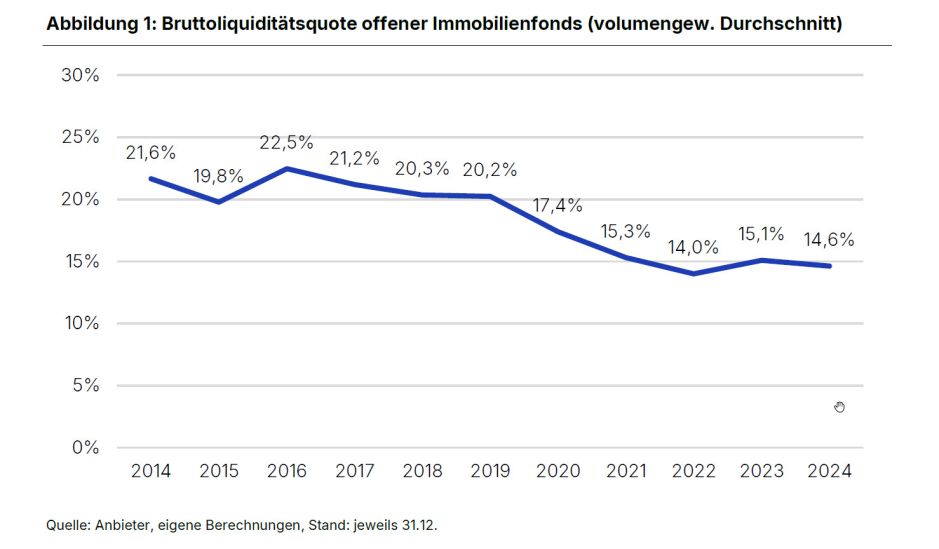 Die europäische Ratingagentur Scope hat untersucht, wie sich die Liquiditäts- und die Fremdkapitalquote offener Immobilienfonds im vergangenen Jahr entwickelt haben. Die Bruttoliquiditätsquote lag Ende 2024 im volumengewichteten Durchschnitt bei 14,6 Prozent. Das ist weniger als ein Jahr zuvor, als die Quote 15,1Prozent betrug. Gestiegen ist dagegen die Fremdkapitalquote: Ende 2024 lag der volumengewichtete Durchschnitt bei 18,1Prozent, 1,7 Prozentpunkte höher als Ende 2023.