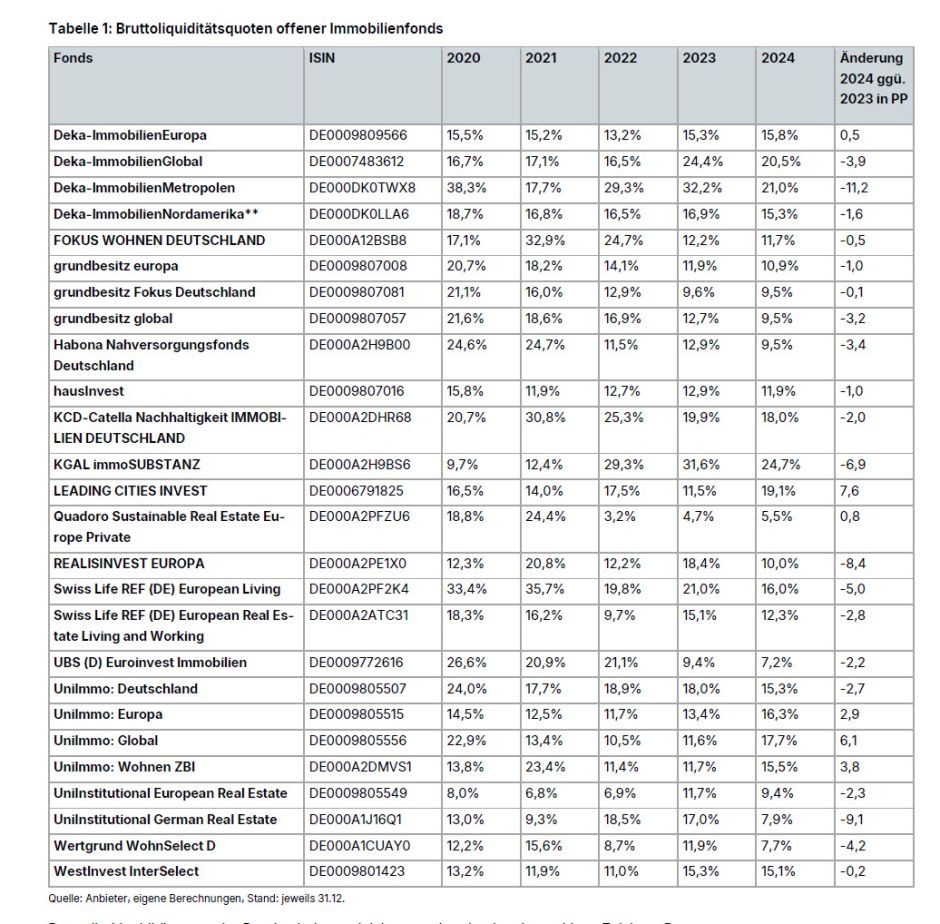 Die Spanne der Liquiditätsquote reicht bei den 26 analysierten Fonds von 5,5 Prozent bis 24,7 Prozent. Beim Gros der Produkte liegt sie zwischen neun und 18 Prozent. Gegen den allgemeinen Trend erhöhte sich 2024 bei sechs Fonds die Quote im Vergleich zum Vorjahr. Bei 20 Fonds sank sie.