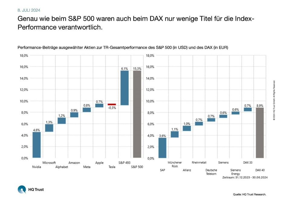 · „Das gilt auch für den Renditeanteil der beitragsstärksten Aktie: Nvidia stand im ersten Halbjahr für 30 Prozent der S&P 500-Performance, SAP sogar für 40 Prozent der DAX-Entwicklung.“