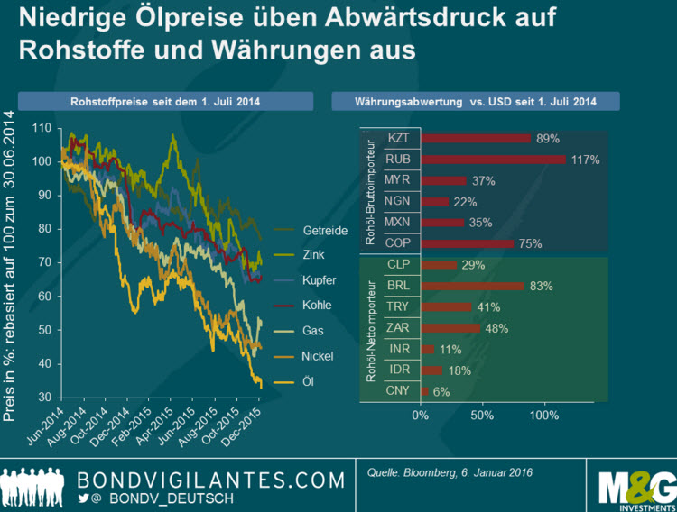 Die fallenden Preise für Rohöl haben weiterhin einen negativen Effekt auf die Anlagepreise in den Schwellenmärkten, obwohl Nettoimporteure von Öl gegenüber den Exporteuren in den Schwellenländern in der Überzahl sind. Dies liegt daran, dass Währungen und Rohstoffe mit Ausnahme von Öl als Ansteckungsquellen agieren.