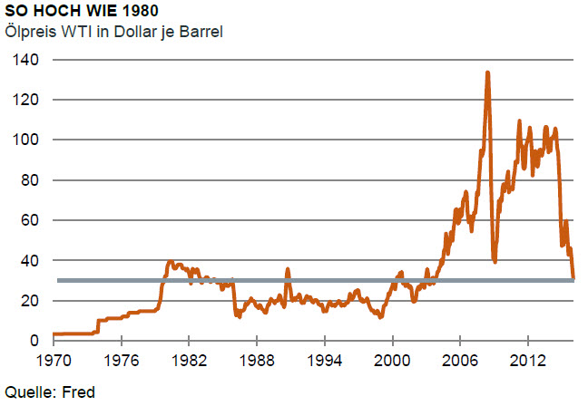 Um die neuen Risiken zu verstehen, muss man sich die langfristige Perspektive anschauen. Der Ölpreis liegt heute mit 31 Dollar je Barrel auf dem Niveau der Zeit der zweiten Ölkrise vor 35 Jahren (siehe Grafik). Das ist für sich ge-nommen schon ungeheuerlich. Berücksichtigt man dazu aber noch die zwischenzeitliche allgemeine Geldentwertung, so ist der Ölpreis heute mit real etwas mehr als 5 Dollar je Barrel so hoch wie vor der ersten Ölkrise 1973. Das machen sich viele nicht klar. Ich war selbst überrascht, als ich mir diese Zahlen angeschaut habe.