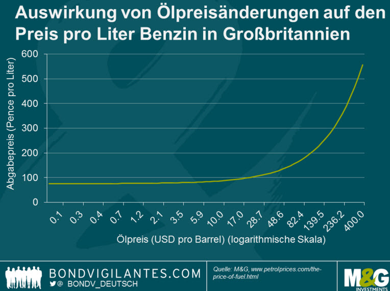 Es besteht erwartungsgemäß kein Eins-zu-Eins-Verhältnis. Ein sinkender Ölpreis wirkt sich deshalb nicht stets in gleicher Höhe auf den Kraftstoffpreis aus, weil er einen immer kleiner werdenden Teil des gesamten Abgabepreises ausmacht. Wenn der Ölpreis von 160 USD um 50% auf 80 USD sinkt, bewirkt dies einen Rückgang des Kraftstoffpreises um ca. 35% von 267 Pence auf 172 Pence. Ein weiterer Ölpreisrückgang um 50% von 80 USD auf 40 USD führt zu einer Kraftstoffpreisreduzierung um 28%. Bei einem nochmaligen 50%-igen Ölpreisrückgang von 40 USD auf 20 USD sinkt der Kraftstoffpreis nur noch um 19%. Zwar wird der Abgabepreis zusätzlich durch den Wechselkurs zwischen GBP und USD beeinflusst, da Öl in USD gehandelt wird, dennoch wird anhand vorstehender Grafik deutlich, dass bei einem kontinuierlichen Ölpreisrückgang die Auswirkung auf die Inflation immer kleiner wird.