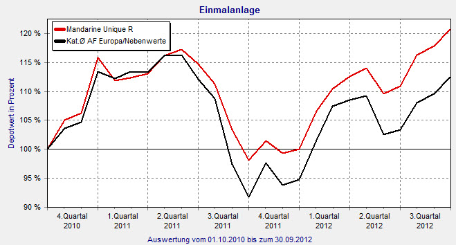 „Seit Jahresbeginn zeigt unser Wachstumsfonds Mandarine Unique eine beeindruckende Wertentwicklung und zeichnet sich durch eine maßgebliche Steigerung des Fondsvermögens aus“, sagt Krebs. Tatsächlich steht für den im März 2012 aufgelegten Fonds im laufenden Jahr bisher (Stichtag 30. September 2012) ein Plus von 20,66 Prozent. Über den Zeitraum von zwei Jahren steht ein Wertwachstum von 20,65 Prozent. Mit einer Volatilität von 12,69 Prozent und einer Sharpe Ratio von 0,68 über diesen Zeitraum liegt der Mandarine Unique im Mittelfeld der Peergroup „Aktienfonds Europa/Nebenwerte“. Das Fondsvolumen beträgt 45,77 Millionen Euro. Die Fondsmanagerinnen Morlet-Selmer und Bruno investieren derzeit (Stand. 31. August 2012) zu 31,5 Prozent in Großbritannien. 19,3 Prozent des Fondsvolumens entfallen auf Frankreich und 13,4 Prozent auf Deutschland. Die Sektorallokation zeigt mit 40,5 Prozent eine starke Gewichtung in der Industrie. In Konsumgüter investieren die Fondsmanagerinnen 16,8 Prozent, in Dienstleistungen 12,8 Prozent. Größter Einzeltitel ist der französische Elektrotechnikkonzern Ingenico mit 4,3 Prozent. Auf den britischen Rüstungs- und Technologiekonzern Babcock International entfallen 4,2 Prozent und 3,4 Prozent auf den niederländischen Elektroausstatter Gemalto.