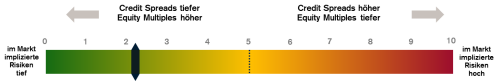 Ohne eine Unterschätzung des Risikos nahelegen zu wollen, spricht dies dafür, dass die Preise für Vermögenswerte künftig erst noch einen erhöhten Grad der Besorgnis hinsichtlich systemischer Risiken signalisieren müssen. Dies zeigt sich am deutlichsten in liquiden kurzfristigen Finanzierungsmärkten, in geringen Renditen für Staats- und Unternehmensanleihen, starker Wertentwicklung bei Aktien und geringer impliziter Volatilität an den Aktien- und Kreditmärkten. Im Gegensatz dazu ist das stärkste Risikosignal in Europa die Unterbewertung des Euro.