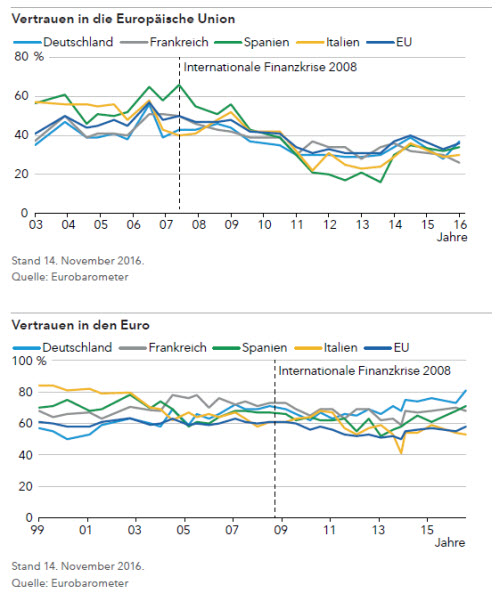 Die Gründe für den Aufstieg des Populismus in Europa – wie hohe Arbeitslosig- keit und Einwanderung – bestehen fort, und seit der internationalen Finanzkrise 2008 hat die Zustimmung zur EU nachgelassen. Die Zustimmung zum Euro blieb aber recht stabil. Hinzu kommt, dass den nationalen Regierungen noch weniger vertraut wird als der Union. So unzufrieden viele Europäer mit der EU sein mögen, so wenig wollen sie sie (jetzt schon) abschaffen. Aber sie wollen, dass sich etwas ändert – wirtschaftlich wie politisch. Und sie sind dafür durchaus zu einer Protestwahl bereit. Doch den Umfragen zufolge wollen die meisten noch immer lieber in der EU leben als außerhalb (und im Euroraum, falls relevant). Es ist extrem schwierig, Faktoren zu prognostizieren, die zum Zerfall einer Währungsunion führen könnten. Meist ist es so weit, wenn ihre Kernländer nicht mehr wollen. Man sollte also vor allem auf Deutschland, Frankreich und Italien achten.