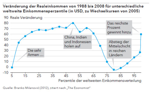 Man sieht, dass die Reichsten viel hinzugewonnen haben, aber auch die Einkommen der wachsenden Mittelschicht in Schwellenländern wie China, Indien und Brasilien deutlich gestiegen sind. Es gibt aber auch eine Gruppe in der Mitte – vor allem die Unter- und Mittelschicht in den reifen Volkswirtschaften Europas und in den USA – deren Einkommen stagnierten. Und auch die Menschen mit den welt-weit niedrigsten Einkommen hatten 2008 nicht viel mehr als 20 Jahre zuvor.