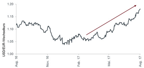 Hinzu kommt, dass Großbritannien und die USA – zwei der Länder in einer politisch besonders brisanten Lage – augenscheinlich auf die Abwertung ihrer Währung im Kampf gegen ihre schwächelnde Wirtschaft setzen. Die seit etwa sechs Monaten gegenüber dem Euro schwächelnde US-Devise hat zudem den Rückenwind für auf Dollar lautende Gewinne in Gegenwind umschlagen lassen – eine Wende um 180 Grad wie Grafik 1 zeigt. In den letzten sechs Monaten bis 1. August 2017 hat die amerikanische Währung um 11,9% gegenüber der Gemeinschaftswährung nachgegeben. Das schmälert den Wert der Gewinne europäischer Unternehmen jenseits des Atlantiks.