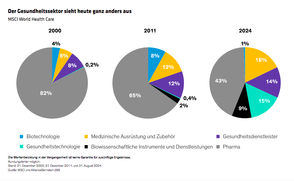 Die Veränderungen der Gesundheits-Aktienindizes in den letzten zwei Jahrzehnten spiegeln diese Verlagerung wider. Die Gewichtung von Pharmaunternehmen im MSCI World Health Care Index ist von 82 % im Jahr 2000 auf heute 43 % gesunken (Abbildung).