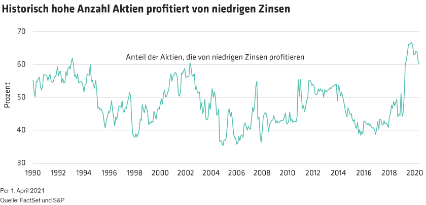 Die großen Tech-Giganten sind nicht die einzigen Namen, die durch steigende Zinsen gefährdet sind. Ein Blick auf den S&P 500 zeigt, dass der Index aus einem historisch hohen Anteil von Unternehmen besteht, deren Aktien bei fallenden Zinsen steigen und bei steigenden Zinsen fallen (Abbildung). Jeder Zinsanstieg könnte dazu führen, dass Aktien, die von niedrigen Zinsen abhängig sind, unerwartet fallen. Portfolios mit einer hohen Konzentration in diesen Namen, wie passive Indexstrategien, könnten ein böses Erwachen erleben.