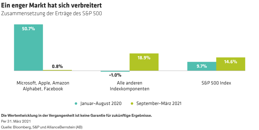 Zwar kann niemand vorhersagen, wann der Markt langfristig umschlägt, aber von Ende 2020 bis zum ersten Quartal 2021 hat die Dominanz der fünf größten US-Aktien bei den Erträgen des S&P 500 deutlich abgenommen (Abbildung). Gleichzeitig gab es Anzeichen einer Verbesserung für aktive Manager. In den ersten drei Monaten des Jahres 2021 übertraf der Prozentsatz der aktiv verwalteten US-Aktienportfolios, die die Benchmark übertrafen, in sechs von neun Morningstar-Stilkategorien den