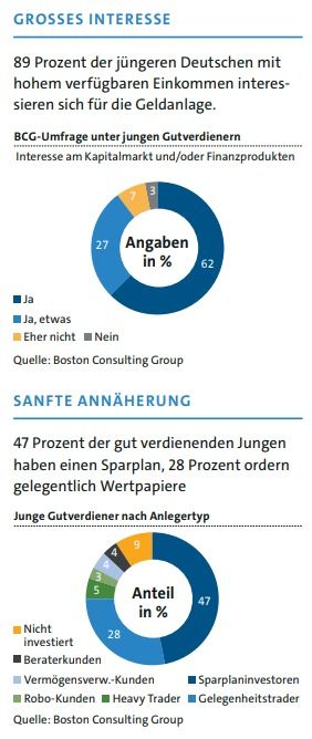 Diese Tendenz zu digitalen Angeboten scheint sich bei der Geldanlage fortzusetzen. Laut einer Studie der Unternehmensberatung E & Y wollen fast 80 Prozent der Millennials künftig digitale Tools für die Verwaltung ihres Vermögens nutzen. Bei den sogenannten Babyboomern sind es nur ein Drittel. Eine Umfrage der Boston Consulting Group (BCG) unter vermögenden jungen Menschen kam zu dem Ergebnis, dass zwar 50 Prozent der Befragten ihre Hauptbankverbindung bei einer Filialbank haben, jedoch 80 Prozent Direktbanken oder Neobroker zur Führung ihres Depots nutzen und fast drei Viertel Online- oder Mobilbanking bevorzugen.