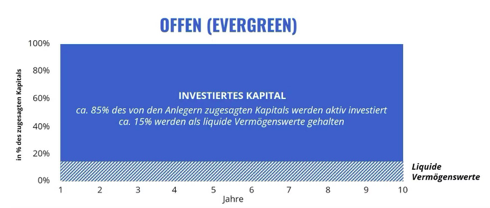 Nur zu Illustrationszwecken. Beachten Sie, dass diese Kennzahlen auf unterschiedlichen Grundlagen berechnet werden (100%-Marke für Evergreen vs. dunkelgrüner Anteil für geschlossene Fonds) und nicht direkt verglichen werden können.