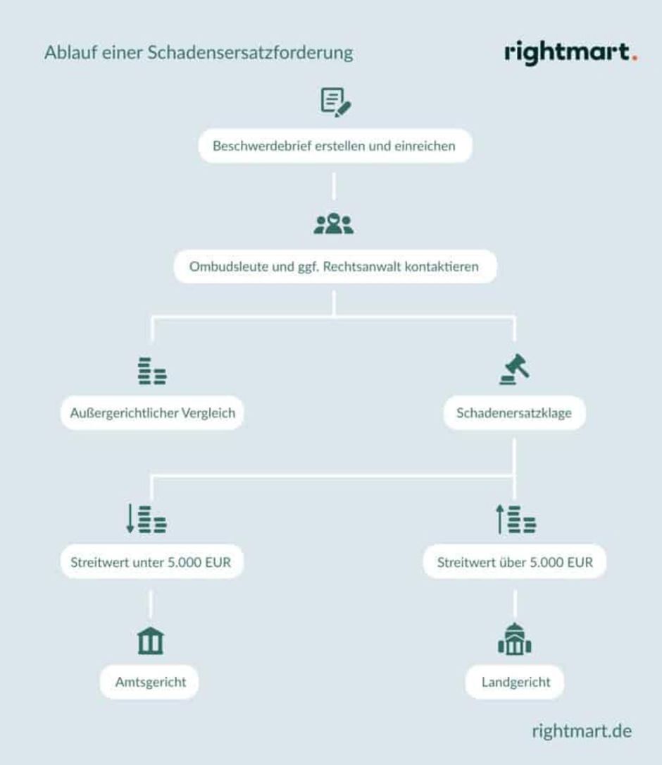Rechtsanwalt Phillip Hammerich von der Kanzlei Rightmart empfiehlt durch Falschberatung geschädigten Anlegern im Internetauftritt der Kanzlei sich zunächst über einen Beschwerdebrief an die Bank zu wenden. Erst wenn dies und die Einschaltung eines Ombudsmanns nicht hilft, rät er zur Schadensersatzklage – anhängig vom Streitwert – beim Amts- oder Landgericht (siehe Grafik2).