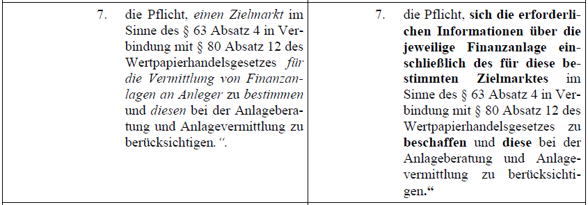 Die ursprüngliche Fassung, die dem Bundestag zur Beschlussfassung vorgelegt wurde, war wesentlich brisanter: Demnach sollten 34f-ler für Finanzprodukte einen Zielmarkt für die Vermittlung von Finanzanlagen an Anleger bestimmen und diesen bei der Anlageberatung und Anlagevermittlung berücksichtigen.