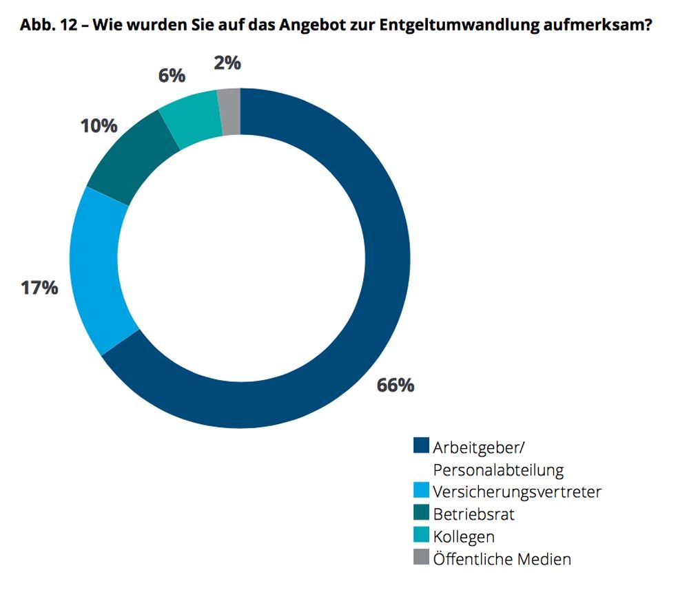 Vor allem bei kleineren und mittelständischen Unternehmen, die über keine eigene Unterstützungskasse, Pensionskasse oder Pensionsfonds verfügen, ist die Direktversicherung – üblicherweise als klassische private Rentenversicherung abgeschlossen – sehr verbreitet. Diese Policen werden häufig von Maklern oder Versicherungsvertretern vermittelt, die das Vertrauen der Verantwortlichen im Unternehmen oder des Arbeitnehmers genießen. Nach einer aktuellen Studie der Unternehmensberatung Deloitte wurden zwar zwei Drittel der Arbeitnehmer von der Möglichkeit einer Betriebsrente durch Entgeltumwandlung durch ihren Arbeitgeber aufmerksam gemacht. An zweiter Stelle folgen mit 17 Prozent Versicherungsvermittler (siehe Grafik baV Vermittlung).
