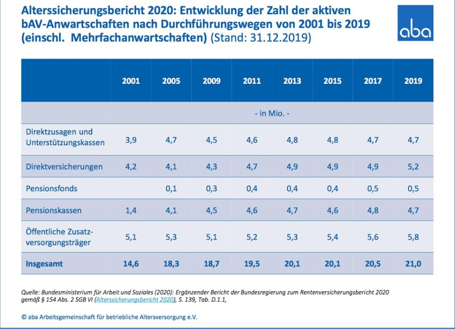 Allerdings bietet das Gesetz den Unternehmen auch die Möglichkeit einer alternativen, für sie deutlich günstigeren – und für die Betriebsrentner ungünstigeren – Regelung. Arbeitgeber, die sich vorab verpflichtet haben, die Rente jährlich um nur ein Prozent zu erhöhen, müssen eine darüber liegende Inflation nicht ausgleichen. Zudem gibt es nur für die Betriebsrentenvariante der Direktversicherung oder Pensionskasse eine für die Arbeitgeber noch günstigere Regelung. Wurde beim Abschluss vereinbart, dass „sämtliche auf den Rentenbestand entfallenden Überschussanteile“ für Erhöhungen verwendet werden, müssen die Arbeitgeber überhaupt keinen zusätzlichen Inflationsausgleich zahlen. Die Überschussanteile ergeben sich aus besonders vorsichtiger Kalkulation der Lebensversicherungen und Pensionskassen, indem sie für die Versicherten eine überdurchschnittlich hohe Lebenserwartung unterstellen. Sterben die Versicherte früher, stehen die Überschüsse für die lebenden Kunden zur Verfügung. In einem aktuellen Urteil des Bundesarbeitsgericht (Az. 3 AZR 408/21) wurde die Klage einer Betriebsrentnerin auf Rentenerhöhung entsprechend der Inflation mit dem Hinweis abgewiesen, dass bei ihrer Betriebsrente sämtliche Überschussanteile für Erhöhungen ihrer Betriebsrente verwendet wurden. Doch mit den Überschussanteilen lässt sich eine so hohe Inflation wie sie aktuell besteht nicht annährungsweise ausgleichen. Die Direktverssicherung und die Pensionskasse nehmen den größten Anteil unter den Betriebsrenten ein. So zählt die Direktversicherung, gemessen an der Anzahl der Anwartschaften, mit 5,2 Millionen Verträgen und die Pensionskassen mit 4,7 Millionen Verträgen, zu den am häufigsten verbreiteten Durchführungswege der baV (siehe Tabelle baV Durchführungswege).