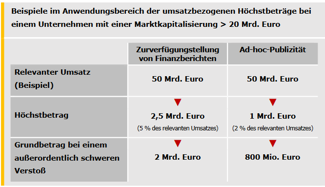 Für einen Emittenten mit einem Gesamtumsatz von 50 Milliarden Euro etwa sind damit Bußgelder von bis zu 5 Prozent des relevanten Gesamtumsatzes, also bis zu 2,5 Milliarden Euro, möglich. Bisher hatte das maximale Bußgeld bei 200.000 Euro gelegen.