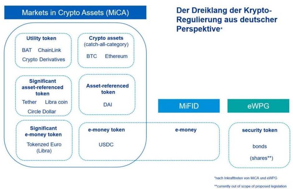 MiCA muss im Zusammenhang mit anderen Gesetzen gesehen werden, die bereits die Kryptoanlagen regulieren. Bereits seit dem 1. Januar 2020 benötigen mit Umsetzung der fünften EU Geldwäscherichtlinie neue Verwahrstellen für Kryptowerte der Genehmigung der BaFin. Bereits bestehende Verwahrstellen mussten ihren Genehmigungsantrag bis 30. Juni 2020 einreichen. Im Zusammenhang mit der Regulierung des digitalen Kapitalmarktes ist zudem das am 10. Juni 2021 in Kraft getretene Gesetz über elektronische Wertpapiere (eWpG) zu sehen. Das eWpG regelt die Emission „klassischer“ Wertpapiere in elektronischer Form der Blockchain-Technologie, indem dieses Gesetz die Möglichkeit des zentralen Registers oder des Kryptowertpapierregister einführte. Mit dem eWpG wurde das deutsche Wertpapierrecht allgemein für elektronische Wertpapiere wie digitale Inhaberschuldverschreibungen oder auch für Wertpapiergattungen wie Aktien und Investmentzertifikate geöffnet. Digitale Finanzinstrumente (Security Token), wie e-Money, sind bereits durch die „Markets in Financial Instruments“-Richtline (MiFID) reguliert. MiCA konzentriert sich daher wie die Studie „Der gigitale Kapitalmarkt“ der Wirtschaftprüfungsgesellschaft KPMG aufzeigt, auf die übrigen Kryptoassets (siehe Grafik1).