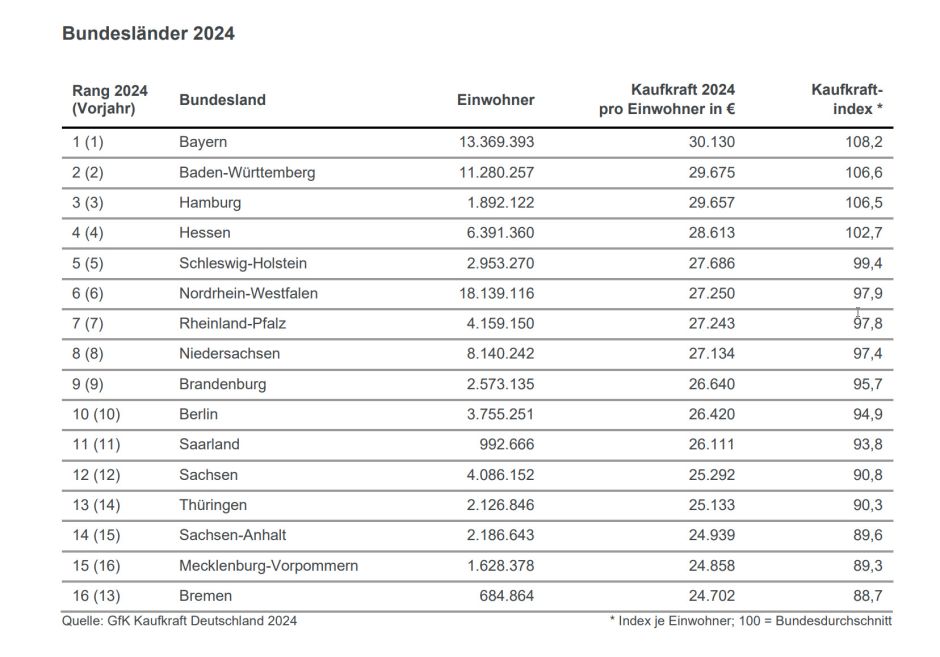 Regionale Kaufkraftverteilung: Bremen ist 2024 Schlusslicht unter den Bundesländern. Ein Blick auf die regionale Verteilung der Kaufkraft in Deutschland eröffnet spannende Einblicke, wo Menschen mit besonders hohem Ausgabepotenzial leben. Bei den Bundesländern belegt wie in den 2 Vorjahren Bayern den ersten Platz. 30.130 Euro stehen den Bayern pro Kopf für ihre Ausgaben und zum Sparen zur Verfügung, womit sie mehr als 8 Prozent über dem Bundesdurchschnitt liegen. Nachdem Baden-Württemberg 2023 an Hamburg vorbeigezogen ist, belegt es 2024 erneut den zweiten Platz. Mit einer Pro-Kopf-Kaufkraft von 29.675 Euro haben die Menschen im dritteinwohnerstärksten Bundesland 18 Euro mehr zur Verfügung als die Hamburger.