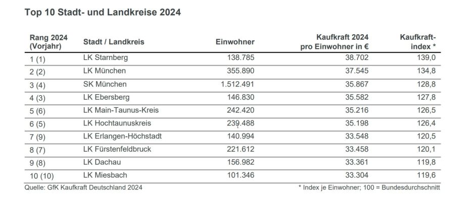 Kaufkraft in den Stadt- und Landkreisen: Die Top 10 Kreise mischen sich einmal durch Wie in den Jahren zuvor ist der bayerische Landkreis Starnberg auch 2024 der unangefochtene Spitzenreiter unter den 400 deutschen Stadt- und Landkreisen. Mit einer Pro-Kopf-Kaufkraft von 38.702 Euro liegt dieser exakt 39 Prozent über dem Bundesdurchschnitt, womit die Starnberger 1.157 Euro mehr als die Einwohner des zweitplatzierten Landkreises München haben. Neuzugänge gibt es dieses Jahr in den Top 10 nicht, dafür werden die Platzierungen drei bis neun durchgemischt.