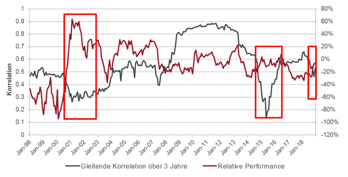 Quelle: Bloomberg, Janus Henderson Investors, 31. Dezember 2018. Vergleich von MSCI Real Estate und Informationstechnologiesektoren in USD. Rote Kästchen verdeutlichen Phasen mit geringer Korrelation auf dem Höhepunkt der Dotcom-Blase sowie in jüngster Zeit. Die Wertentwicklung in der Vergangenheit ist kein zuverlässiger Indikator für die künftige Wertentwicklung.