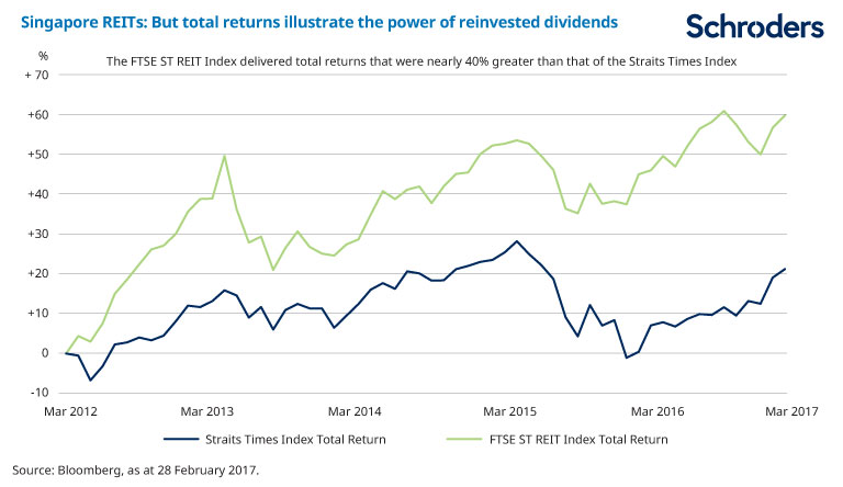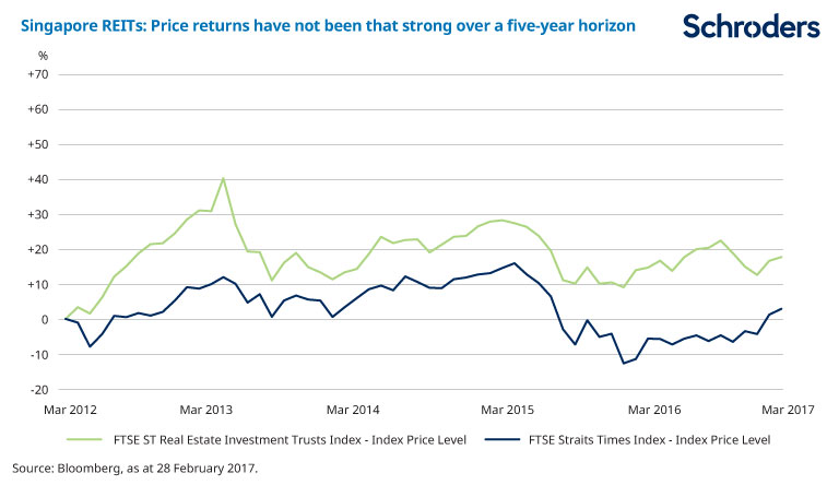 For example, the benchmark FTSE ST REIT Index (FTSREI) in Singapore has returned +19.7% over five years on a purely price return basis versus the broader Straits Times Index’s +3.2% gain.