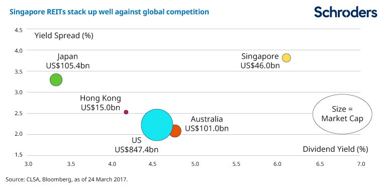 Furthermore, REITs in Singapore also offer a dividend yield that still possesses a significant yield spread (which we mentioned earlier) over its own government’s 10-year bond yield. Comparing it to other REIT markets globally, on a dividend yield basis, it has also performed well.