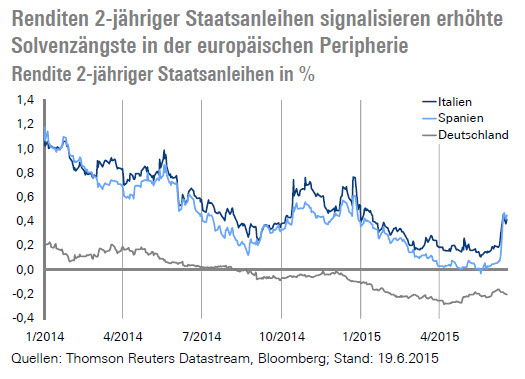 In den vergangenen Tagen zeigten die Finanzmärkte in der Eurozone eine erste Reaktion auf die gestiegenen Risiken eines Grexits. So stiegen die Renditen 2-jähriger Staatsanleihen aus Spanien und Italien signifikant – in einem Umfeld stabiler Renditen von 2-jährigen Bundesanleihen.