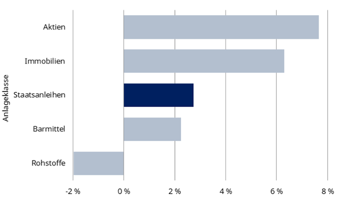 Die zweitbeste Wertentwicklung unter den analysierten Vermögenswerten verzeichneten Immobilien bzw. Gewerbeimmobilien, bei denen die Rendite durchschnittlich 6,3 % betrug. Dahinter folgten Staatsanleihen und Barmittel.