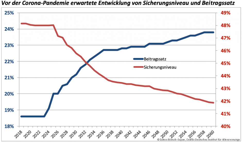 Bei einer tiefen Rezession rechnen die Wissenschaftler mit einem Anstieg auf 52 Prozent. Da diese auch als Sicherungsniveau bezeichnete Größe die Relation der Rente des sogenannten Standardrentners zum Durchschnittslohn beschreibt, ist daran zu erkennen, dass Rentenempfänger viel weniger von der Pandemie betroffen sein werden als die Erwerbsbevölkerung. Deren Nettolöhne sinken im Vergleich zu den garantierten Renten sogar nominal.