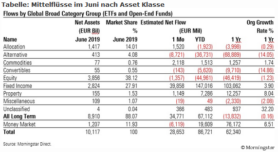 Für Investoren ist das ein Anreiz, im Vorgriff auf die absehbaren Notenbankmaßnahmen jetzt schon auf breiter Front in Anleihen zu investieren. Auch das entspricht dem alten Reflex. Doch das Risikomaß spielt offensichtlich nur noch eine untergeordnete Rolle. Es geht nur noch darum, positive Renditen zu erzielen. Staatsanleihen fallen da weitestgehend aus. Es bleiben nur noch riskantere Papiere. Das lässt sich an den aktuellen Umsatzzahlen ablesen: Laut Morningstar-Analyse floss Rentenfonds im Juni die Rekordsumme von insgesamt netto 39,9 Milliarden Euro zu. Gefragt waren vor allem europäische Unternehmens-Anleihen. Gleichzeitig flossen nur 1,4 Milliarden Euro aus Aktienfonds ab. Angesichts der dunklen Wolken über dem Konjunkturhimmel ist das ein erstaunlich geringer Verlust. Mischfonds konnten im Juni netto sogar wieder ein Plus von 1,5 Milliarden Euro verbuchen.