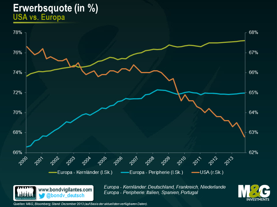 Obwohl die Arbeitslosenzahlen in Europa ziemlich ernüchternd sind, tendieren die Erwerbsquoten im Allgemeinen nach oben. Dies gilt sowohl für die Kernländer als auch für die Peripheriestaaten Europas (siehe Grafik), wobei es nicht so ist, dass lediglich positive Daten aus Deutschland die dürftigen Zahlen in anderen Ländern kaschieren. Dafür gibt es diverse Gründe. So ist beispielsweise der Anteil erwerbstätiger Frauen in den letzten Jahren gestiegen, während in einigen Staaten zeitgleich das Renteneintrittsalter angehoben wurde.