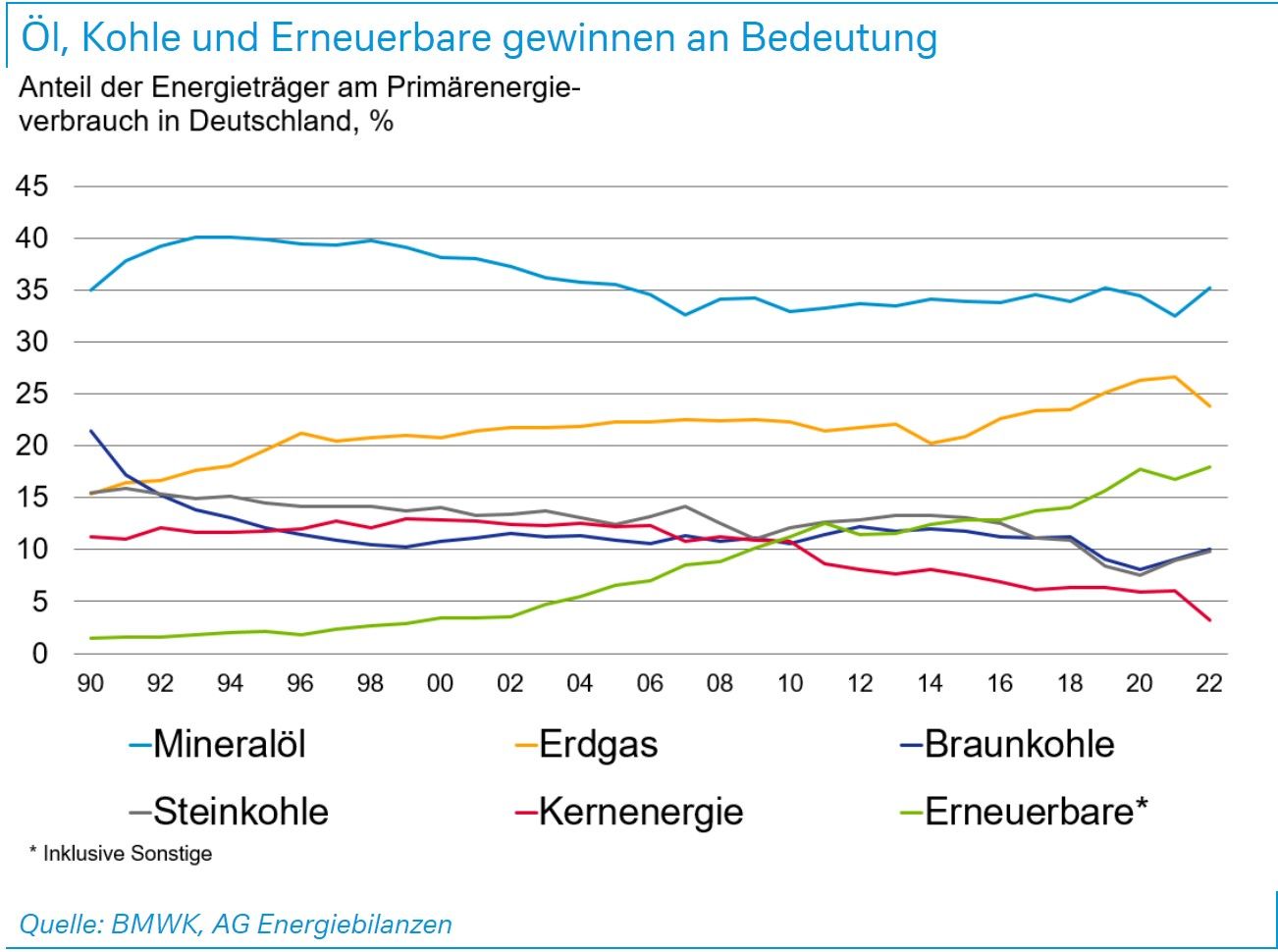 Trotz der geringeren absoluten Energieimporte musste Deutschland wegen der gestiegenen Preise deutlich mehr für seine Einfuhren zahlen. Der gesamte Primärenergieverbrauch in Deutschland sank 2022 um knapp 5 Prozent. Öl, Kohle und Erneuerbare haben ihren Anteil am Energiemix ausgebaut, Erdgas und Kernenergie an Bedeutung verloren.
