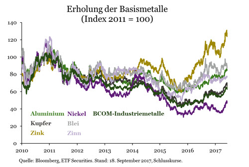 Industriemetalle befinden sich derzeit im Aufschwung. Der Bloomberg Industrial Metals Subindex hat zum Beispiel seit Jahresbeginn um 17 Prozent zugelegt. Industriemetalle erreichten zuletzt 2011 einen Höhepunkt, büßten aber in der Folge 60 Prozent ein, bis sie 2016 die Talsohle durchschritten . Inzwischen wurden im Zuge der Rally, die 2016 begann, rund 34 Prozent dieser Verluste wieder aufgeholt. Derzeit steht aber nur Zink höher als im Jahr 2011. Die anderen Metalle sind noch nicht zu ihren früheren Niveaus zurückgekehrt.