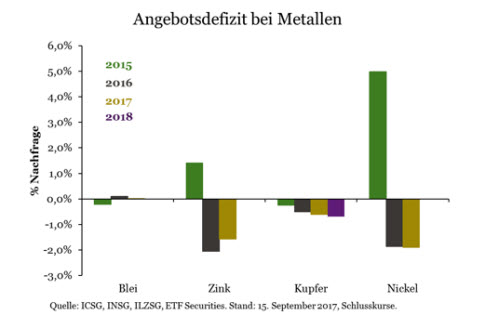 Bei Zink, Kupfer und Nickel wird die Nachfrage voraussichtlich über dem Angebot liegen. Bei diesen Metalle besteht bereits seit mehreren Jahren eine Angebotslücke. Bei Kupfer geht das Angebotsdefizit inzwischen in das achte Jahr und, wenn sich die Prognosen der International Copper Study Group als richtig erweisen, wird es 2018 im neunten Jahr in Folge zu Lagerentnahmen kommen. Der Bleimarkt befindet sich im Allgmeinen im Gleichgewicht. Aluminium könnte in ein Angebotsdefizit geraten, wenn China in den Wintermonaten wegen der Umweltbelastungen tatsächlich Kapazitäten stilllegen sollte (siehe Verknappung des Metallangebots aufgrund ökologischer Bedenken).