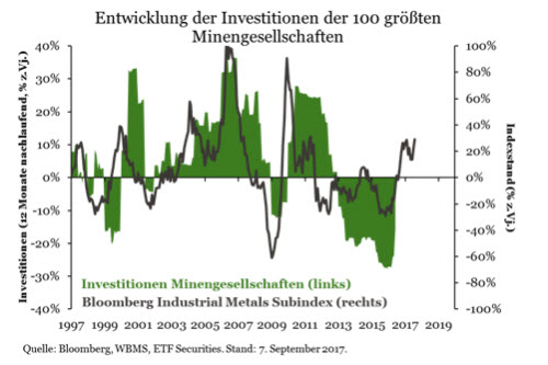 Als die Preise für Industriemetalle 2011 zu fallen begannen, brachen die Investitionen der Minengesellschaften ein. Mitte 2017 lagen die Investitionen der hundert größten Minen 60 Prozent tiefer als Mitte 2013. Da bei Minen nach der Investition und Fertigstellung lange Anlaufzeiten zu erwarten sind, rechnen wir nicht damit, dass die Knappheit des Minenangebots in nächster Zeit nachlässt.