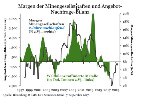 In der Vergangenheit fanden Metallmärkte immer erst zwei Jahre, nachdem die Gewinnmargen der Minengesellschaften den Tiefpunkt erreicht hatten, ins Gleichgewicht zurück. Die Margen der Minen fielen Anfang 2016 auf ein Tief von 2 Prozent und haben sich seither auf knapp über 7 Prozent erholt. Wenn sich also die Geschichte wiederholt, sollte es Ende 2018 zu einer Zunahme des Angebots kommen, aber bis das Gleichgewicht wiederhergestellt ist, könnten Jahre vergehen.