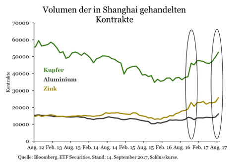 Im November 2016 erfolgte ein Preisrückgang kurz nachdem das Handelsvolumen der chinesischen Terminkontrakte gestiegen und in der Folge wieder gefallen war. Die Preisvolatilität war also weitgehend eine Folge der Handelsvolatilität. Damals verstärkten die chinesischen Behörden die Regulierung, um die destabilisierenden Geschäfte „durchreisender“ Anleger und damit ihren Markteinfluss einzudämmen. Als das Handelsvolumen an der Terminbörse in Shanghai im August zunahm, sahen wir erneut eine herdenartige Kaufpanik, die sehr schnell wieder abflauen könnte.